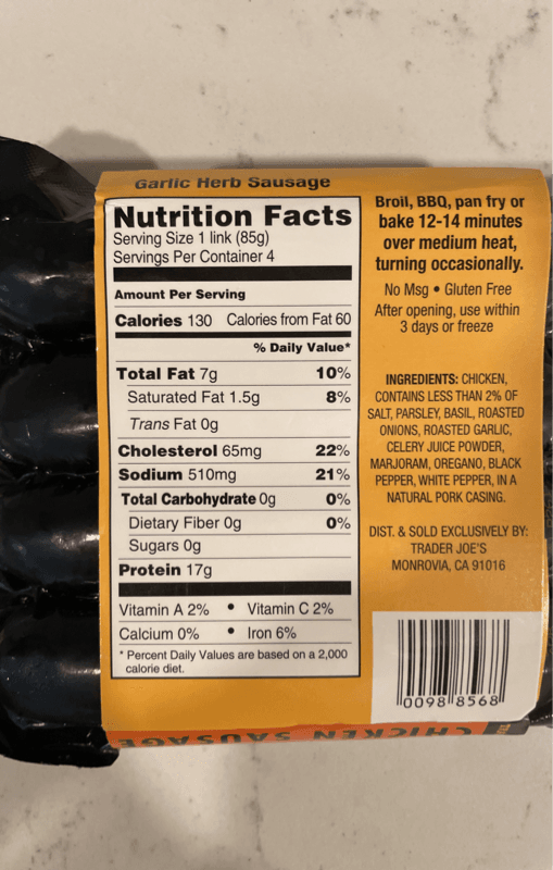 Chicken, contains less than 2% of salt, parsley, basil, roasted onions, roasted garlic, celery juice powder, marjoram, oregano, black pepper, white pepper, in a natural pork casing.