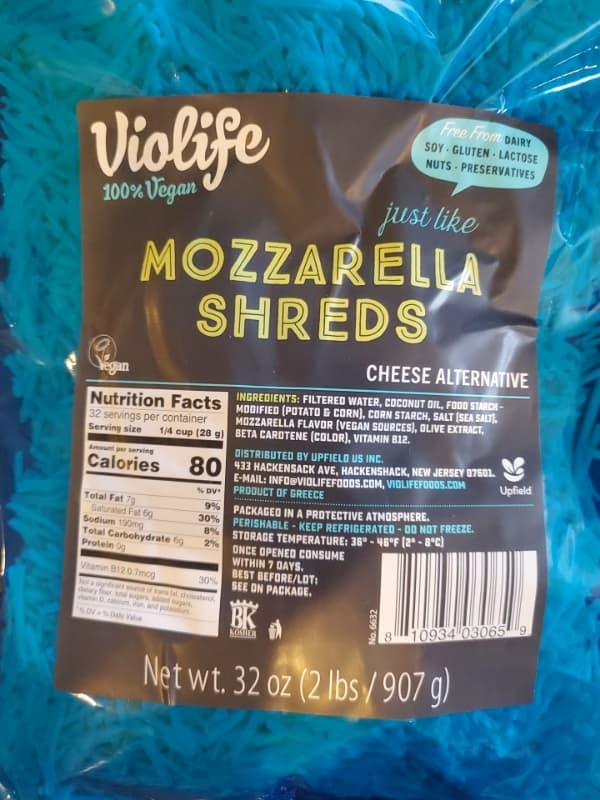 Filtered water, coconut oil, food starch-modified (potato & corn), corn starch, salt (sea salt), mozzarella flavor (vegan sources), olive extract, beta carotene (color), vitamin b12.