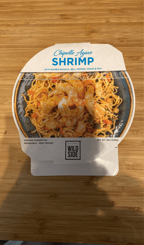 Noodles (enriched flour [unbleached wheat flour, malted barley flour, niacin, iron, thiamine mononitrate, riboflavin, folic acid, ascorbic acid, alpha, amylase], water, salt, lightly coated with soybean salad oil), shrimp (red shrimp [pleoticus muelleri], sodium metabisulfites, sodium citrate, citric acid), chipotle ramen sauce (sweet chili [sugar, water, pickled red chili, vinegar, garlic, salt, stabilizer: xanthan gum {e415}], water, lime juice, sugar, chipotle puree [chipotle peppers, vinegar, salt], tomato paste [vine-ripened fresh tomatoes], agave nectar, korean chili powder [dried red pepper powder], sesame oil blend [soybean oil, sesame oil], distilled vinegar, garlic puree, modified food starch, salt, garlic powder, onion powder), green peas, diced red bell peppers, diced green bell peppers, diced onions, cilantro.
